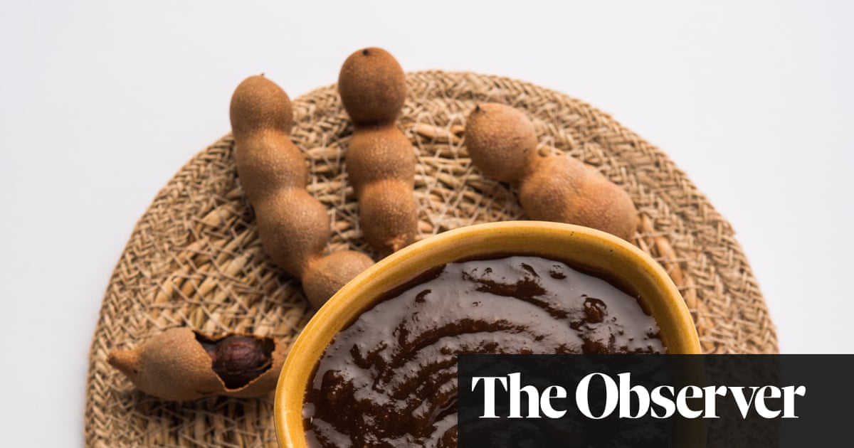 Tamarind pods grow on trees in hot climates all over Asia and Africa. You can also find them in corner shops and online. Crack the outer shell and inside there’s a fibre that holds pulp – tangy, with a slightly sweet undertone – and seeds together. Take the shell off, soak the sticky insides in hot water for about half an hour, then mash it up, take out the seeds and you’ll have a thick brown liquid.